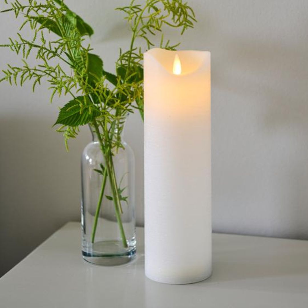 The candle has a rustic wax surface and an antique shape on top. The dynamic 3D flame and the shape of the wax give an authentic and warm light and a beautiful play of shadows on the environment.